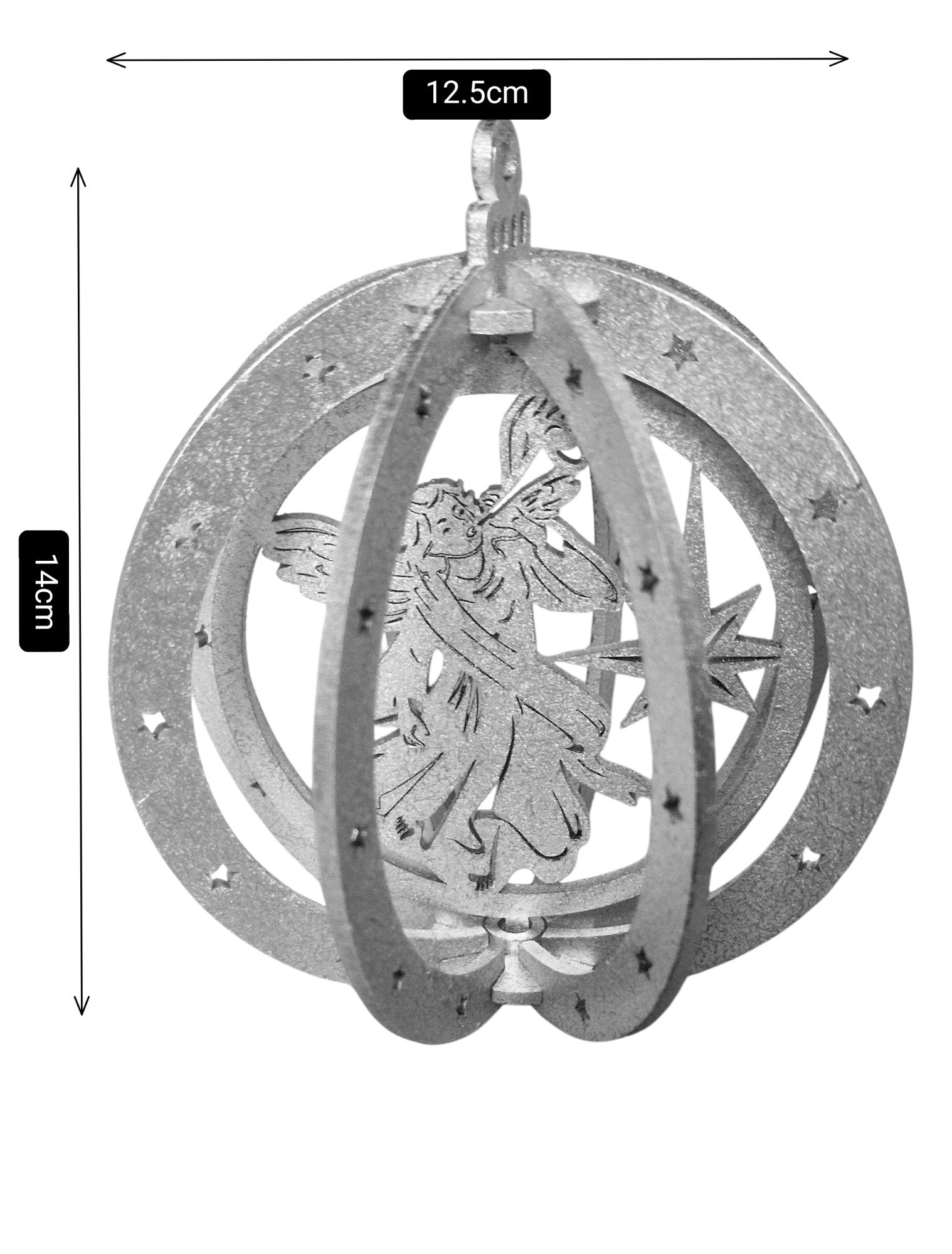 Feiern Sie den wahren Geist von Weihnachten mit dieser eleganten 3D-Krippenszene-Weihnachtskugel. Gefertigt aus hochwertigem Holz mit einem glänzenden silbere Finish, zeigt dieses kunstvolle Ornament die Heilige Angel in filigranem Laserschnitt-Design. Die kugelförmige, mehrschichtige Struktur mit kleinen Stern-Ausschnitten verleiht Tiefe und Glanz und macht dieses Schmuckstück zu einem besonderen Highlight an Ihrem Weihnachtsbaum oder Ihrer Festdekoration.